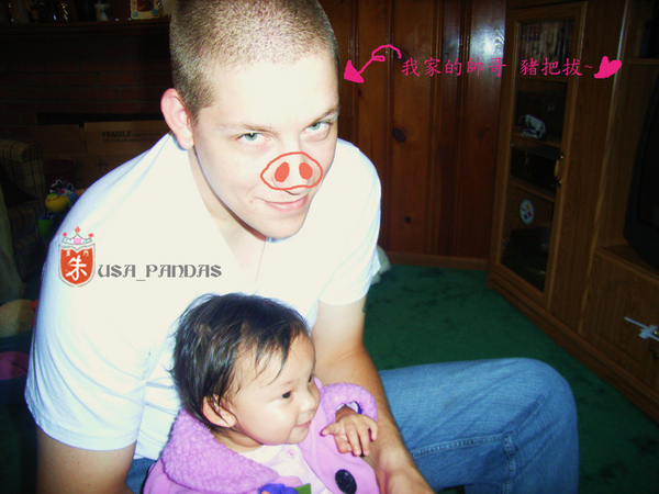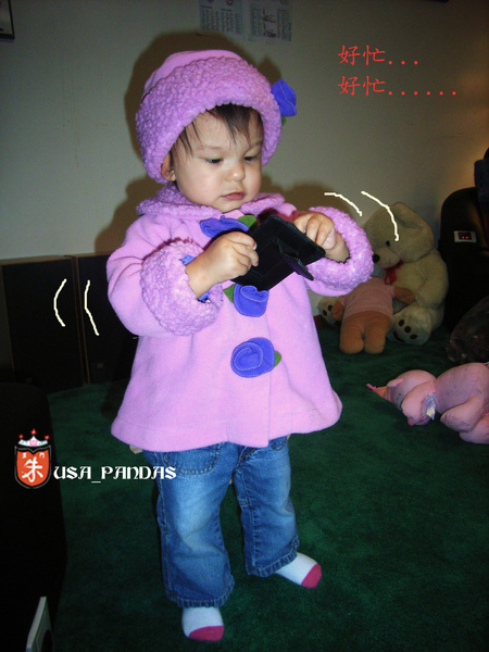 【註】: 因為我們所有的東西都在我們房間裡,有的地方也沒有baby proof。所以天才老爸就用一堆雜七雜八的東西堆成一座堡壘(或者該稱之為"長城"? (笑) )將她堵開,有時難度高的連我都很難"爬"過耶~